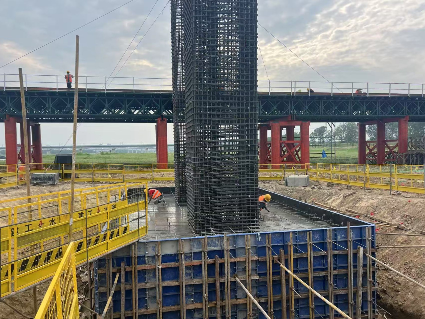 為確保此次澆筑工作順利進行,項目周密部署,從施工方案制定到現(xiàn)場資源調(diào)配,每一個環(huán)節(jié)都嚴格把關,并做好安全技術交底。施工過程中,在鋼筋綁扎焊接、模板安裝、墩柱鋼筋預埋、混凝土澆筑振搗、找平抹面、溫控監(jiān)測及覆蓋養(yǎng)護等關鍵環(huán)節(jié),安排專人全程監(jiān)督,落實各項標準化施工要求,全力確保首個承臺高質(zhì)量完成澆筑。